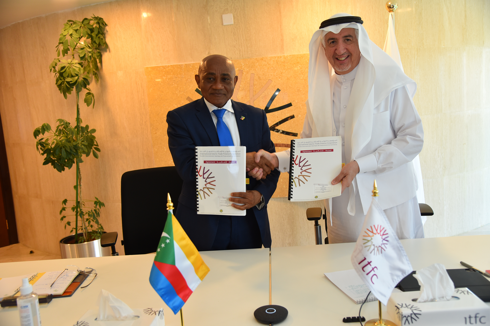 The International Islamic Trade Finance Corporation (ITFC) (www.ITFC-idb.org), approved two new financing facilities for EUR 35 million in favor of the Union of Comoros, with EUR 25 million dedicated to support the import of energy commodities such as petroleum products and LPG, while EUR 10 million will be allocated to the import of food commodities. Both agreements were signed during a ceremony held in ITFC headquarters in Jeddah, Saudi Arabia, between Eng. Hani Salem Sonbol, ITFC CEO, and HE. Kamalidini Souef, Minister of Finance, Budget and Banking Sector (Islamic Development Bank (IsDB) Governor) of the Union of Comoros.