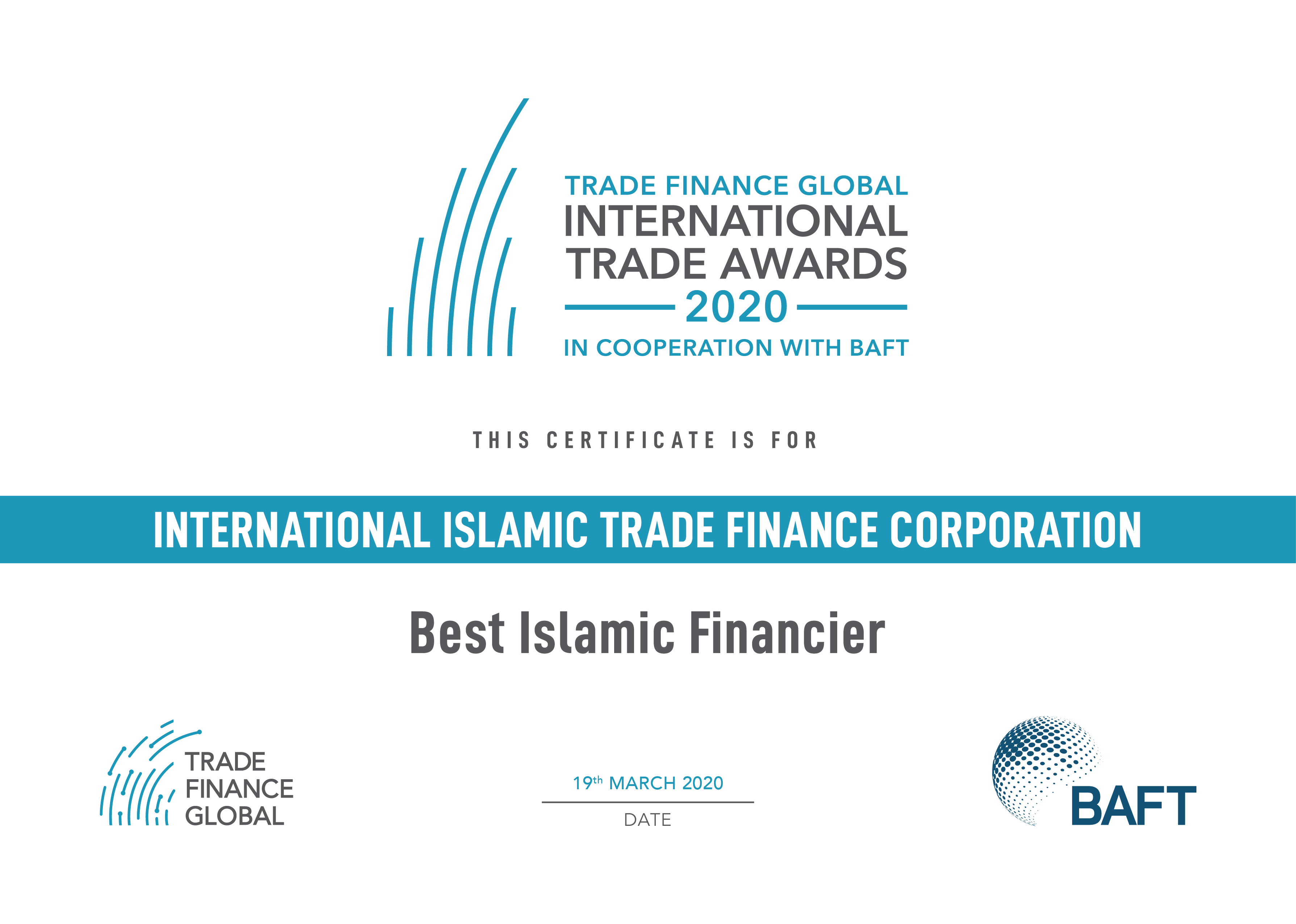 International Islamic Trade Finance Corporation recognized as Best Islamic Financier at the International Trade Finance Global (TFG) Trade Awards 2020