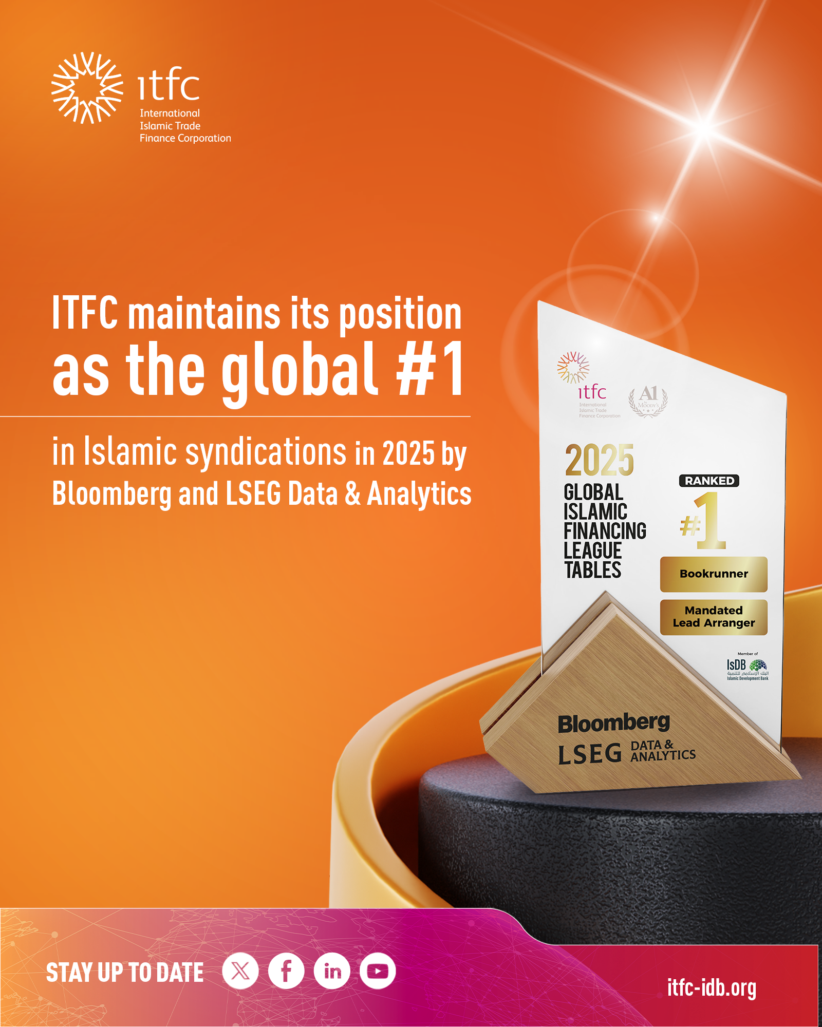 La Société Internationale Islamique de Financement du Commerce (ITFC) (www.ITFC-IDB.org), membre du Groupe de la Banque Islamique de Développement (BID), a été classée n° 1 mondial des teneurs de livres et des arrangeurs principaux mandatés (MLA) dans les League Tables 2025 de Bloomberg et LSEG Données et Analyses sur les syndications islamiques, marquant ainsi cinq années consécutives de leadership sur le marché des syndications islamiques.
